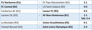Ce sont donc bien trois clubs Tarnais qui verront le cinquième tour: Lavaur, Saint-Juéry et l’Union Graulhetoise. Toutes nos félicitations aux 6 clubs qui ont porté haut et fort les couleurs du football Tarnais, et tous nos encouragements pour le prochain tour aux trois qualifiés.