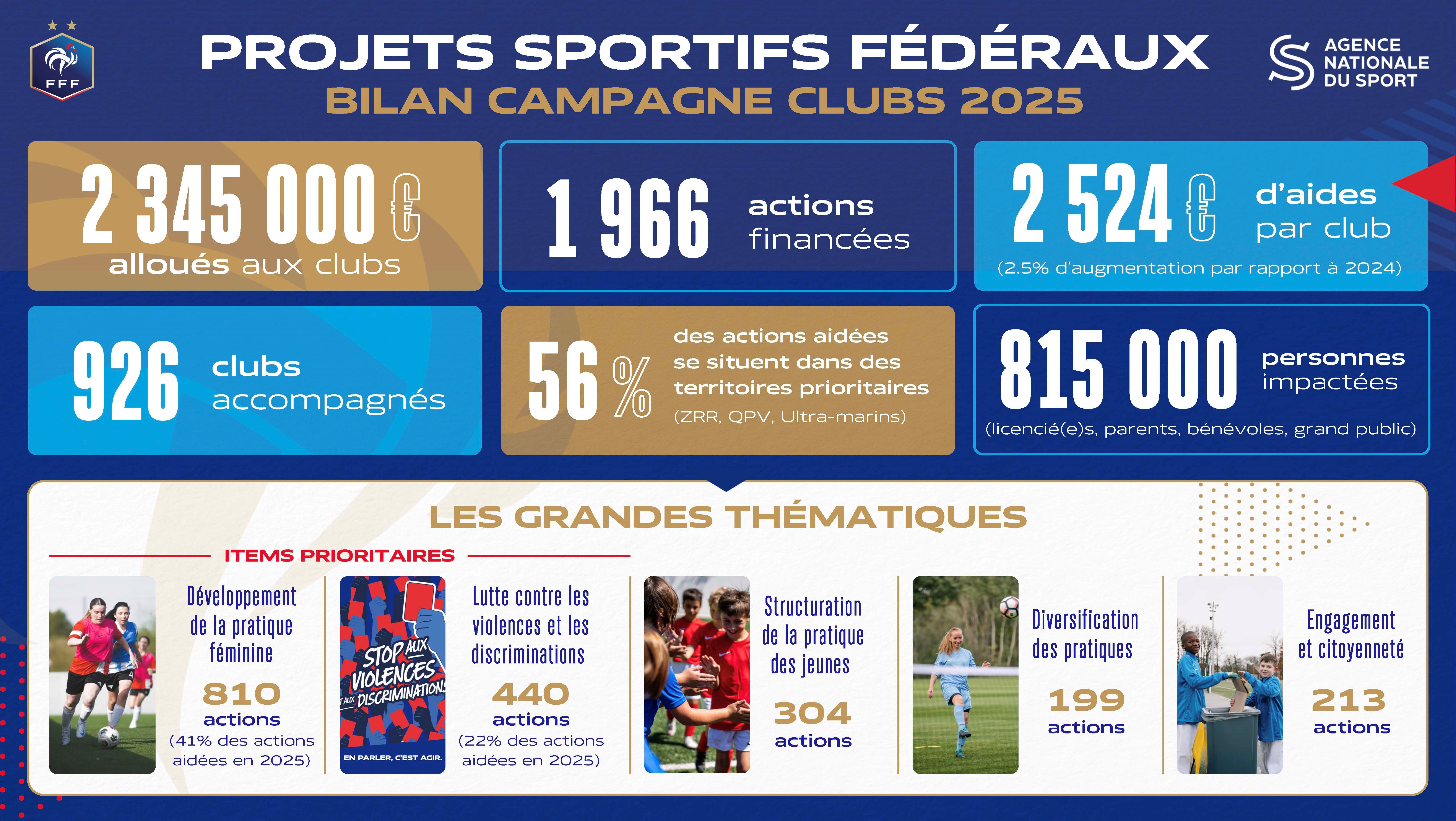 Pour la huitième année consécutive, la FFF pilote le dispositif des Projets Sportifs Fédéraux (PSF) au profit de ses clubs affiliés. En 2025, près de 1 000 ont été accompagnés financièrement, avec une aide moyenne de 2 500 euros d’aide par structure. La campagne 2026 s’inscrit dans la continuité de celle de l’an dernier et met l’accent sur deux priorités fédérales : le développement de la pratique féminine et la lutte contre toutes les formes de violence et les discriminations.
