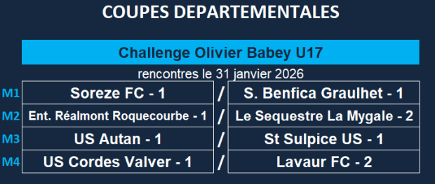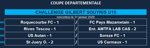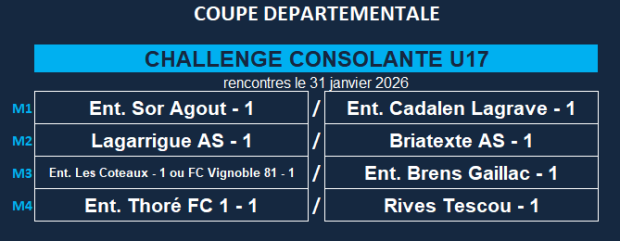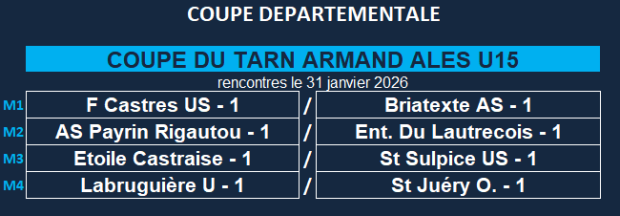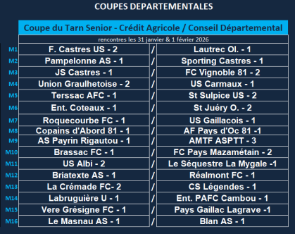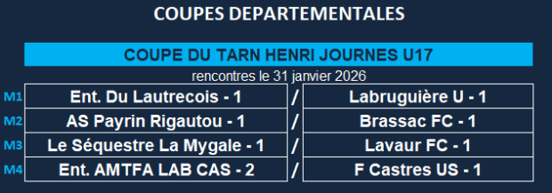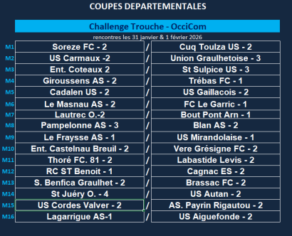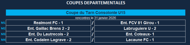 Les tirages de la Coupe du Tarn Seniors Crédit Agricole NMP/ CD81, du Challenge Manens Transakauto et du Challenge Trouche OcciCom Télécom, de la Coupe du Tarn U15, du Challenge U15, de la Consolante U15, de la Coupe du Tarn U17, du Challenge U17 et de la Consolante U17 ont eu lieu au District du Tarn de Football à Graulhet le mardi 9 décembre à 12H00 (en direct live Facebook).