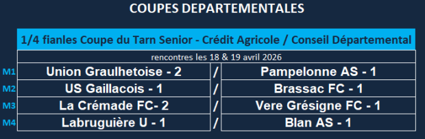 Les tirages des 1/4ème Coupe du Tarn CA/CD81, des 1/4ème Challenge Manens Transakauto, des 1/4ème Challenge Occicom Télécom, des 1/2 finales Coupe Tarn Féminine MMA 3 ASSUR et un tour de Cadrage Coupe du Tarn U18 Féminine MMA 3 ASSUR ont eu lieu le mardi 7 avril au siège du District et en direct live Facebook à 18h00.